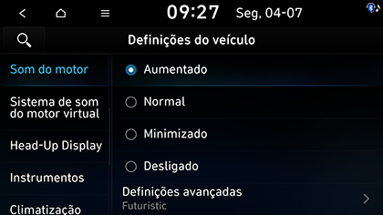 Selecione os itens pretendidos. Pode definir o modo de som do motor para Aumentado, Normal, Minimizado ou Desligado.