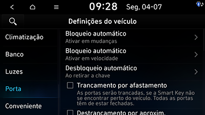 Desbloqueio automático: define a condição para todas as portas serem automaticamente destrancadas. Pode selecionar Ao retirar a chave, Ao ativar mudança P, Ativado c/o veículo deslig. ou Desligado.