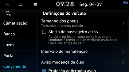 Pressione SETUP > Veículo > Conveniente.