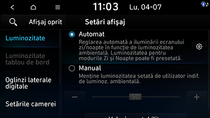 • Oglinzi laterale digitale (dacă este echipat): Setează luminozitatea oglinzilor retrovizoare digitale ale șoferului și pasagerilor.
