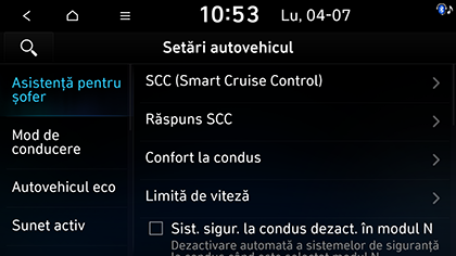 Apăsați SETUP > Autovehicul > Asistență pentru șofer.