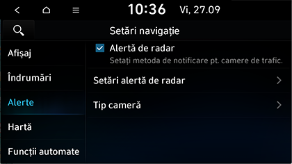 Setări alertă de radar: Reglează setările pentru alerta camerei.