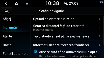 Afișare rută când autovehiculul e oprit: Setează afișarea prezentării rutei în timpul staționării.