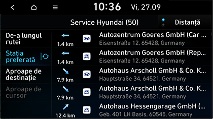 De-a lungul rutei: Caută service-uri Hyundai pe ruta curentă. Disponibil doar dacă destinația este setată.