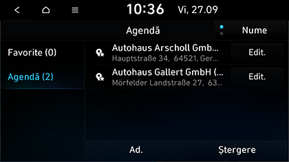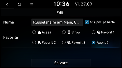 Apăsați NAV > Agendă > Favorite și pe elementul dorit pentru a salva locația. Sau apăsați NAV > Agendă > Agendă > Ad..