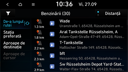 Apăsați NAV > Punct de interes în apropiere > Stații de alimentare.