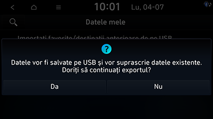 Apăsați SETUP > Navigație > Funcții automate > Datele mele > Export favorite și destinații anterioare pe USB.