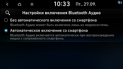 Режим Bluetooth-аудио можно настроить на автоматическое включение при воспроизведении звука на подключенном телефоне. Даже если включен другой режим или все режимы мультимедиа отключены, при воспроизведении Bluetooth-аудио на телефоне режим мультимедиа автоматически переключается на Bluetooth-аудио, и вы можете управлять воспроизведением с телефона. Перед выполнением настроек убедитесь, что телефон сопряжен с информационно-развлекательной системой и подключен к ней.