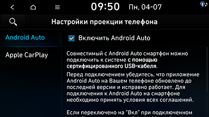 В этом меню приложения Android Auto и Apple CarPlay могут быть включены посредством установки соответствующего флажка.