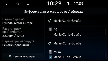 Информация о маршруте/Опции объезда: отображение информации о маршруте и улиц, которые можно исключить.
