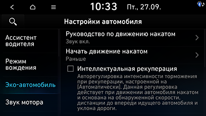 • Руководство по движению накатом: подсказки движения по инерции помогают экономить топливо, указывая водителю, когда следует убрать ногу с педали газа. Можно выбрать Звук вкл. или Звук выкл..