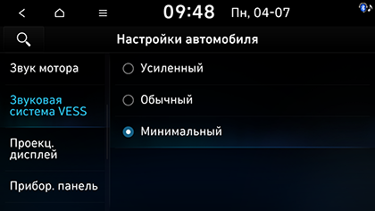2. Выберите требуемые элементы. Режим звука двигателя можно установить на Усиленный, Обычный, Минимальный или Выкл..