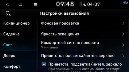 • Приветств. подсветка/интел. зеркало: настройка условий для включения функции приветствия зеркал и света.