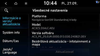 Môžete zobraziť verziu softvéru, verziu firmvéru, verziu aplikácie pre navigáciu, verziu mapy a identifikačné číslo zariadenia.