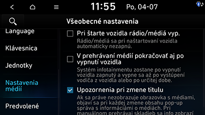 Upozornenia pri zmene titulu: Vyskakovacie okno s informačným upozornením o médiu sa zobrazí vždy po zmene obsahu (okrem prípadov, ak sa momentálne zobrazuje obrazovka médií.) Pri zmene skladby po stlačení hardvérového tlačidla sa však informácie o médiu zobrazia vždy.