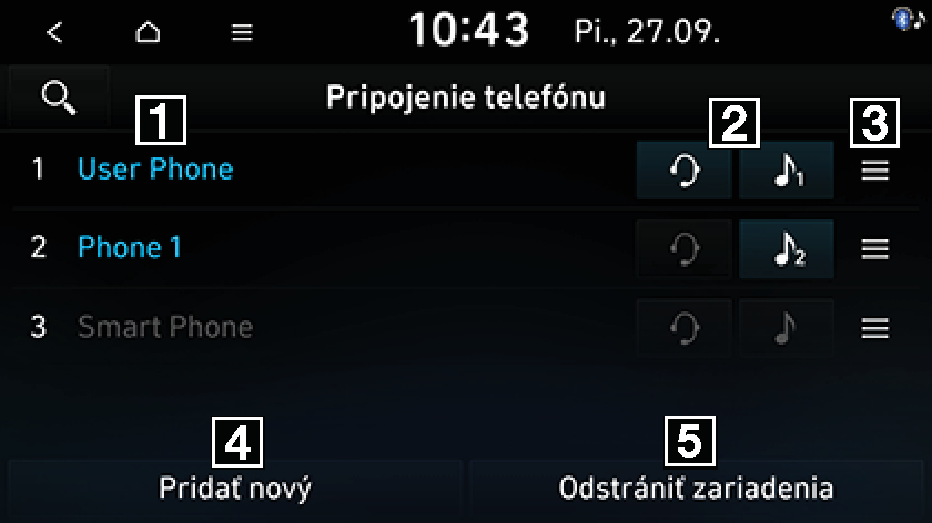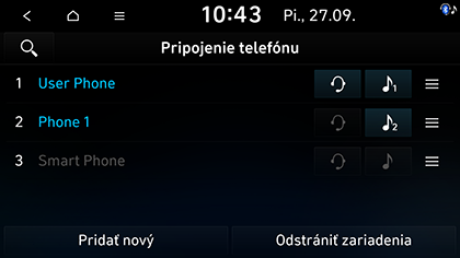 Zobrazí zoznam zariadení spárovaných pomocou rozhrania Bluetooth. Pri výbere zo zoznamu sa zariadenie pripojí alebo odpojí.