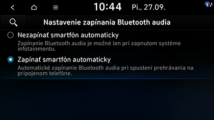 Režim zvuku Bluetooth môžete nastaviť tak, aby sa automaticky aktivoval, keď pripojený telefón prehráva zvuk. Aj keď je aktivovaný iný režim alebo sú vypnuté všetky režimy médií, ak na telefóne prehrávate zvuk Bluetooth, režim médií sa automaticky prepne do režimu zvuku Bluetooth, aby ste mohli ovládať prehrávanie na telefóne. Pred nastavením skontrolujte, či je telefón spárovaný a pripojený k systému infotainmentu.