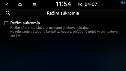 Môžete nastaviť režim ochrany osobných údajov. Keď je aktivovaný režim ochrany osobných údajov, nezobrazujú sa kontakty, história hovorov, obľúbené položky ani správy.