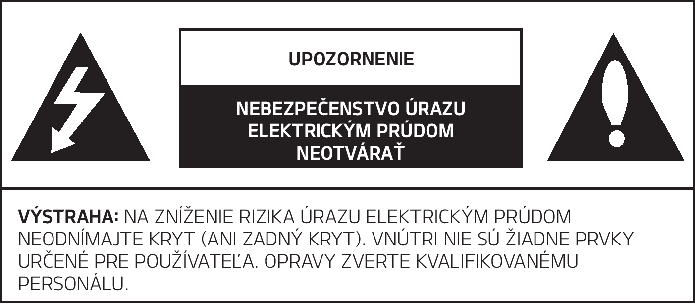 Neodnímajte zadný kryt tohto zariadenia. Znížite tým riziko zasiahnutia elektrickým prúdom. Vo vnútri zariadenia sa nenachádzajú žiadne prvky opraviteľné používateľom. Opravy zverte kvalifikovanému servisnému personálu.