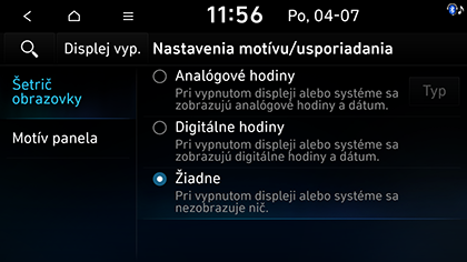 Šetrič obrazovky: Zvoľte šetrič obrazovky. Ako šetrič obrazovky si môžete zvoliť možnosť Analógové hodiny, Digitálne hodiny alebo Žiadne.