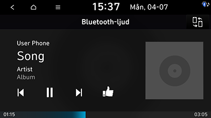 Bluetoothljud kan endast spelas upp när en Bluetooth® telefon har anslutits. För att spela upp Bluetoothljud, anslut Bluetoothtelefonen till bilens system. För mer information om Bluetooth anslutning, se ”Synkronisera och ansluta enheten till en Bluetooth-telefon” delen.