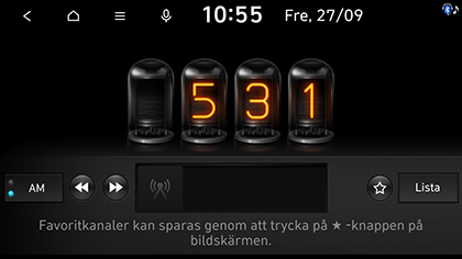 Tryck på DAB/FM eller FM för att ändra bandet till AM-radio, om radiobandet är inställt på DAB(i förekommande fall)/FM. Den senaste stationen som du lyssnade på visas.