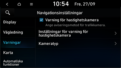 Inställningar för varning för hastighetskamera: Justerar kameravarningsinställningarna.