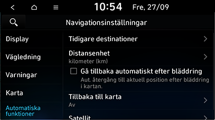 Gå tillbaka automatiskt efter bläddring: Ställer in fordonet så att det automatiskt återgår till mitten av kartan.