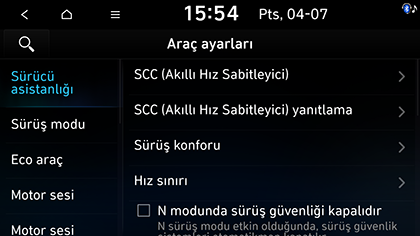 SCC (Akıllı Hız Sabitleyici) yanıtlama (Varsa): Akıllı Hız Kontrol cihazının tepki derecesini önde giden araca göre ayarlar. Hızlı, Normal veya Yavaş seçimini yapabilirsiniz.