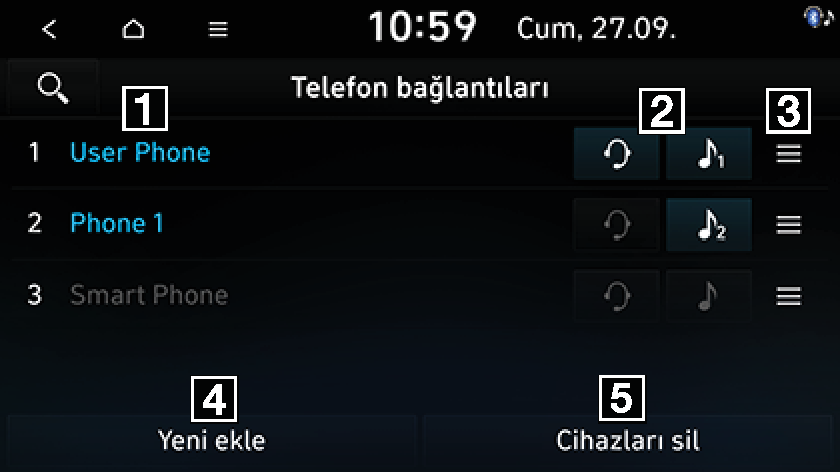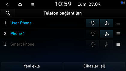 Eşleştirilmiş Bluetooth cihaz listesini görüntüler. Listeden seçim yaparken cihaz ya bağlıdır ya da bağlantısı kesilmiştir.