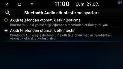 Bluetooth ses modunu, bağlı telefon ses çaldığında otomatik olarak etkinleşecek şekilde ayarlayabilirsiniz. Diğer mod etkinleştirildiğinde veya tüm medya modu kapatıldığında bile telefonunuzda Bluetooth ses oynatırsanız, medya modu otomatik olarak Bluetooth ses moduna geçirilir ve böylece telefonda oynatımı kontrol edebilirsiniz. Lütfen ayarlamadan önce telefonunuzun eşleştirildiğini ve bilgi-eğlence sistemine bağlı olduğunu kontrol edin.