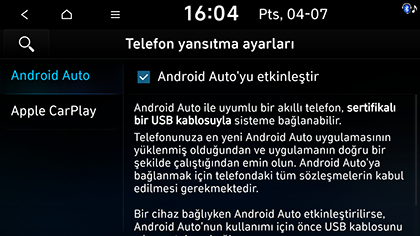 Bu menüde Android Auto ve Apple CarPlay bir onay imi ile etkinleştirilebilir.