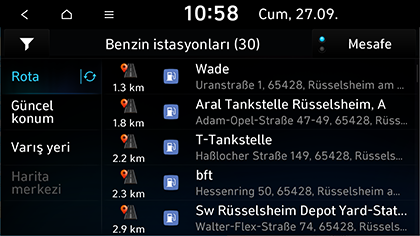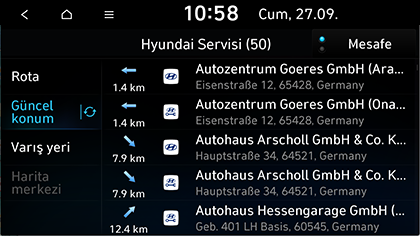 Rota: Geçerli rota boyunca Hyundai servislerini arar. Yalnızca varış noktası ayarlıysa kullanılabilir.
