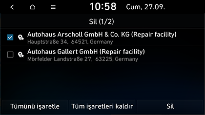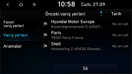 Önceki varış noktalarını silmek için Sil sekmesine basın. İstenen öğeyi seçin, ardından Sil sekmesine basın.