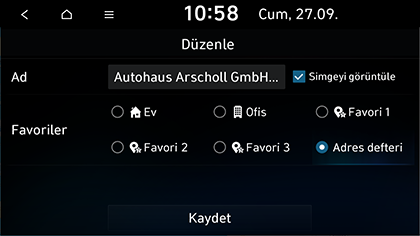 NAV > Adres defteri > Favoriler sekmelerine ve istediğiniz öğeye basarak konumu kaydedin. Alternatif olarak NAV > Adres defteri > Adres defteri > Ekle sekmelerine basın.