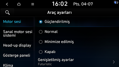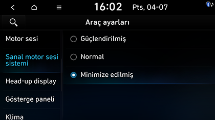İstediğiniz ögeleri seçin. Motor sesi modunu Güçlendirilmiş, Normal, Minimize edilmiş veya Kapalı olarak ayarlayabilirsiniz.