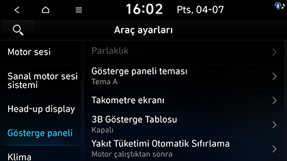 Parlaklık: Gösterge panelinin parlaklığını ayarlar.