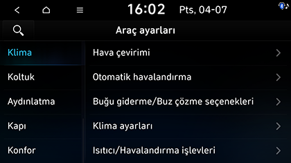 Klima ayarları: Klima kontrolündeki işlevi ayarlar.