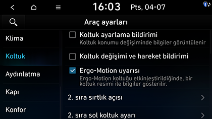 Ergo-Motion uyarısı: Ergonomik hareketli koltuk etkinleştirildiğinde, işlem bilgisi koltuk resmiyle gösterilir.