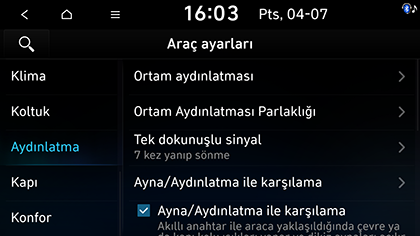 Ayna/Aydınlatma ile karşılama: Karşılama aynası ve ışığının etkinleştirilme durumunu ayarlar.
