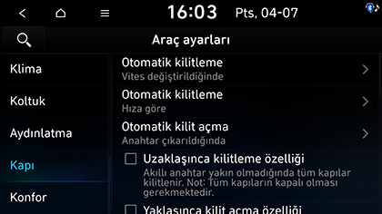 Otomatik kilitleme: Tüm kapıların otomatik olarak kilitlenme koşulunu ayarlar. Hıza göre etkinleştir, Vites değiştirildiğinde, R, N veya D viteslerine geçişte etkinleştirilir., veya Kapalı öğelerini seçebilirsiniz.