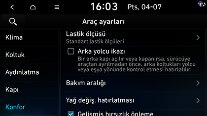 Bakım aralığı: Belirlenmiş servis zamanı geldiğinde bir uyarı görüntülenir. Mesafeyi ve süreyi ayarlayın veya sıfırlayın.