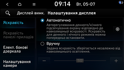 Автоматично: автоматичне перемикання яскравості відповідно до яскравості оточення в режим день або ніч (які можна налаштувати).