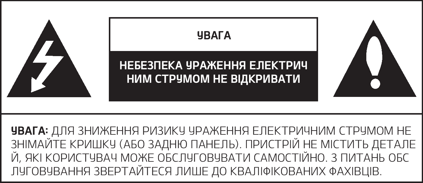 Для зниження ризику ураження електричним струмом не знімайте кришку або задню панель виробу. Він не містить деталей, які користувач може обслуговувати самостійно. З питань обслуговування звертайтеся лише до кваліфікованих фахівців.