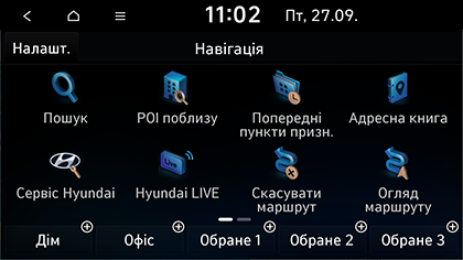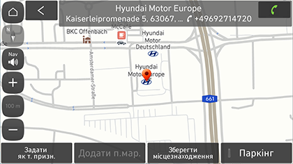 Пункт признач.: пошук сервісних центрів Hyundai поблизу від поточного місця призначення. Доступно лише за наявності встановленого місця призначення.