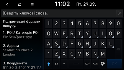 Уведіть ключове слово, таке як точка інтересу, категорія, адреса, координати точки інтересу, й тоді натисніть OK.