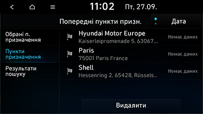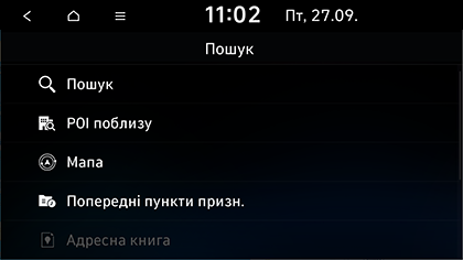 Місце призначення можна вибрати серед місць, збережених в меню Адресна книга. Щоб користуватися цією функцією більш ефективно, заздалегідь збережіть ті місця призначення, в які ви часто подорожуєте.