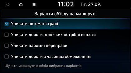Натисніть Варіанти об’їзду на маршруті. Установіть або зніміть позначки для параметрів уникання і натисніть [
