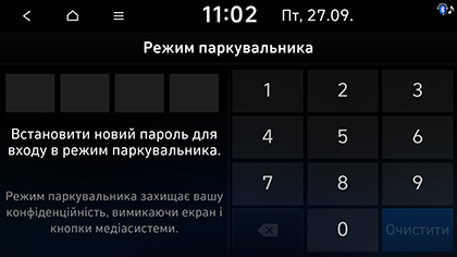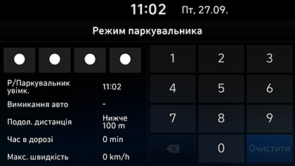 Для вимикання режиму паркувальника введіть пароль з чотирьох цифр, який використовувався для вмикання режиму паркувальника, або скористуйтеся додатком у смартфоні.