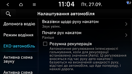 • Вказівки щодо руху накатом: підказки щодо руху за інерцією допомагають водієві економити пальне, рекомендуючи в потрібні моменти прибрати ногу з педалі акселератора. Можна вибрати Звук увімк. або Звук вимк..
